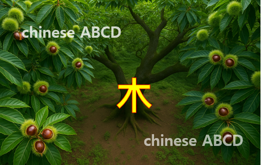 木(나무 목)한자의 조합시에 “지지된 구조에서 갈라서 얻다.“의 의미핵심이 있고 “뿌리부분 단단히 지지된 나무에서 가지,꽃,열매로 나누어지는 구조“으로 표현했습니다.
