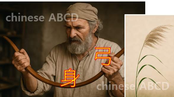 中 : gōng (궁) 부수 : 身 (몸 신) + 弓 (활 궁) 뜻 : 몸을 활처럼 구부릴 수 있는 유연한 신체 + 겸손과 성찰의 태도 그림한자공부 |