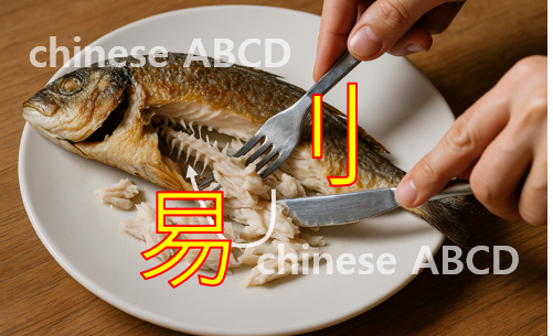 따라서 “칼과 포크로 생선의 뼈 사이로 살을 파내는 모습“으로 표현했습니다.