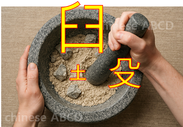 :  huǐ       부수 :  殳(칠 수)   :  臼(절구 구) + 土(흙 토) + 殳(칠 수)