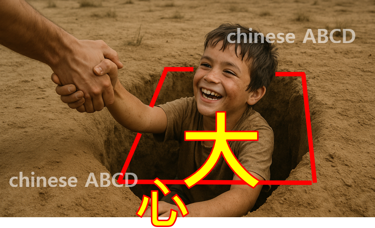 恩 (은혜 은)은 보통 감사, 자비 의미로 많이 쓰입니다. ‘주위 도움에 펼쳐지는 진심의 마음 ‘을 ‘구덩이에 빠져나오며 도움 받는 소년의 진심어린 표정’으로 표현했습니다.