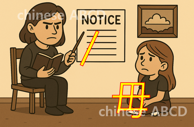 가르침이나 야단을 맞는 자세로 보이며 가운데의 획은 “몽둥이” 모습으로 “하지 말라” 야단치는 모습입니다.