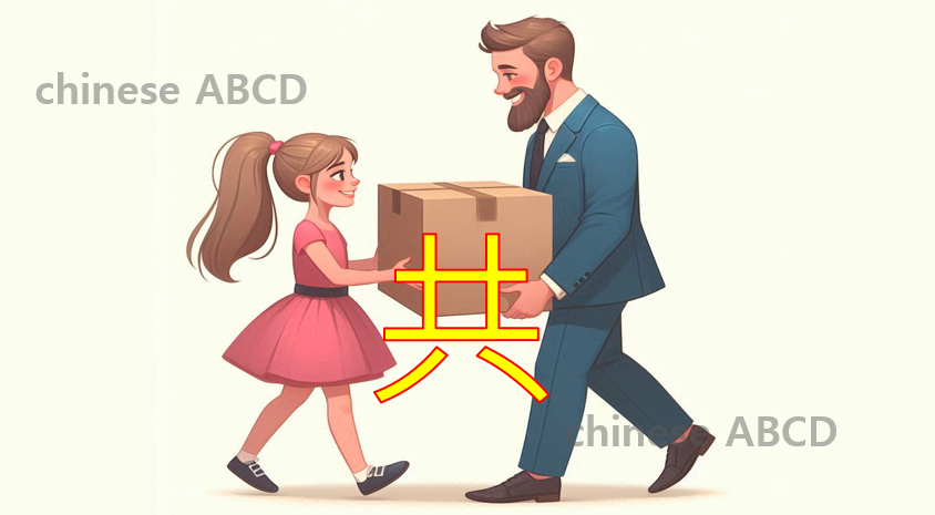 ◆ 스토리1 – 박스를 함께 들어서 서로 받아 들인다. –> 여러 손이 함께 물건을 들면 共이 되고, 이를 사람에게 주면 供, 마음을 더하면 恭이 됩니다. “받아들이고 서로 존중한다”는 의미 확장입니다.
